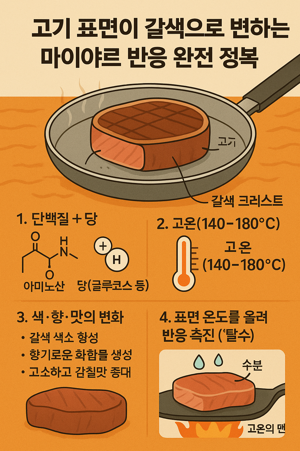 즉, “물을 빼고, 열을 올리는 것”이 마이야르 반응의 기본 조건입니다.